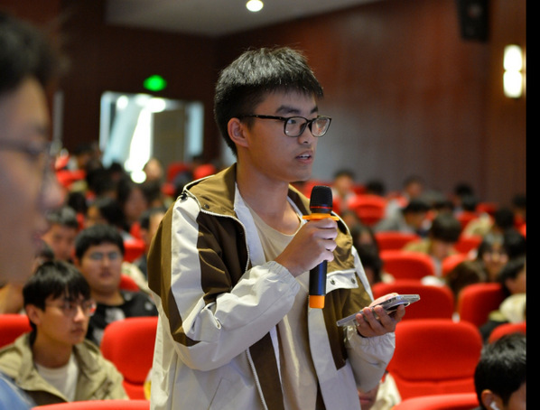 刘通与同学们进行了深入的互动交流。针对关于“如何避免过度依赖AI”的提问,刘通回应:“AI是工具不是‘替身’,专业课是根基,用AI查资料、提效率可以,但不能代写作业、考试。核心竞争力要握在自己手里,要做会使用AI工具的人”。