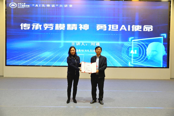 人工智能学院党委书记夏为菊为刘通颁发了“AI先锋说”大讲堂“纪念证书”。她表示,“AI先锋说”大讲堂的首期开讲为参会师生带来了一堂有温度、有深度的“劳模大思政课”,后期学院将持续邀请行业榜样分享交流,推动人才培养与产业发展精准对接,为学院人才培养注入新动能。