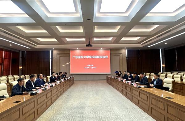 本网讯(融媒体中心)11月11日下午,广东医科大学党委副书记黄达海一行来我校调研交流。校党委书记虞宝桃在磬苑校区主持召开调研座谈会。