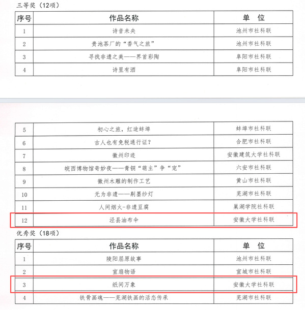 近日,由安徽省社会科学界联合会主办的安徽省第三届“人文社科之光”社科普及短视频大赛评选结果正式揭晓。我校社科联报送的《泾县油布伞》获得三等奖,《纸间万象》获得优秀奖。