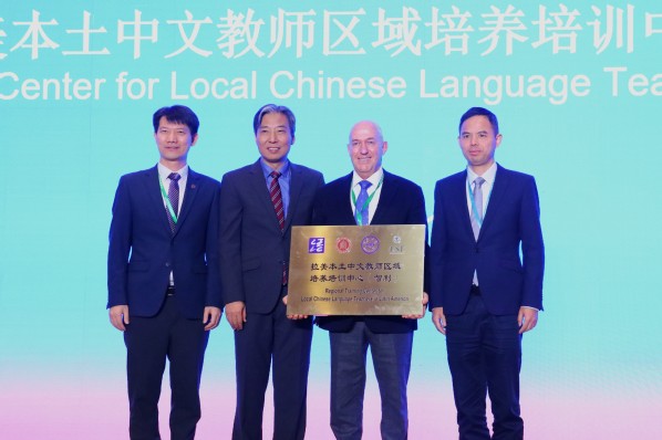 郁云峰授“拉丁美洲本土中文教师区域培养培训中心”牌