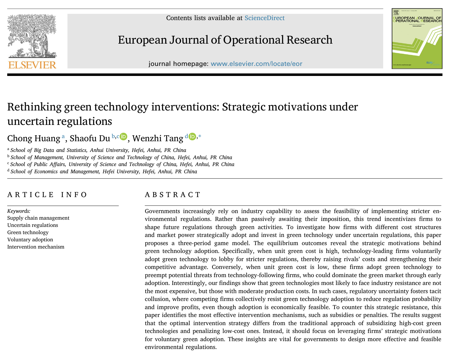 本网讯(大数据与统计学院)我校大数据与统计学院黄冲老师在不确定环境政策下的绿色干预政策设计研究中取得新进展,相关成果以《Rethinking green technology interventions: Strategic motivations under uncertain regulations》为题,发表在国际权威期刊《European Journal of Operational Research》。黄冲老师为论文第一作者,安徽大学大数据与统计学院为第一作者单位。
