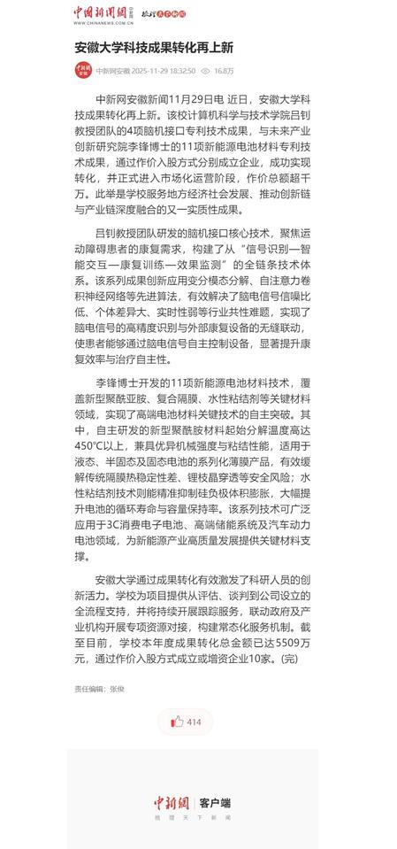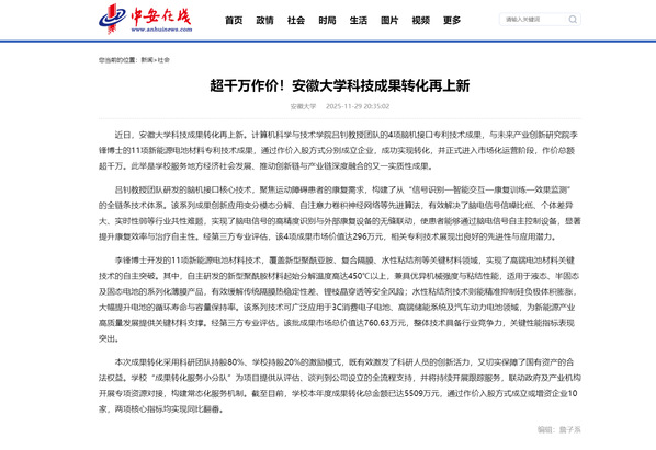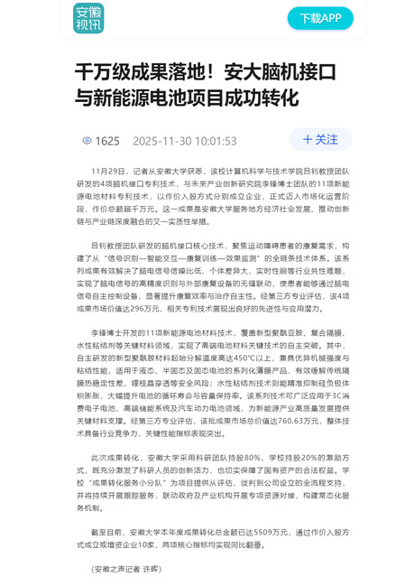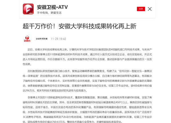记者11月29日从安徽大学获悉,该校计算机科学与技术学院吕钊教授团队的4项脑机接口专利技术成果,与未来产业创新研究院李锋博士的11项新能源电池材料专利技术成果,通过作价入股方式分别成立企业,正式进入市场化运营阶段,作价总额超千万,有效推动创新链与产业链深度融合。
