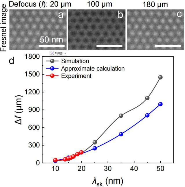图1:(a)-(c)在离焦值分别为20、100和180微米时获得的菲涅尔图像;(d)斯格明子尺寸(λsk)与Δf的依赖关系。