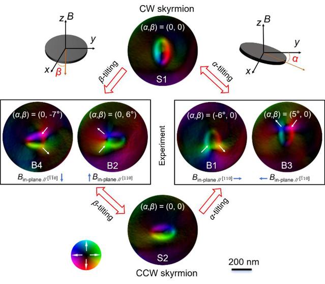 图2: 由沿[110], [110],[110]和[110]方向的面内磁场分别诱导,产生的逆时针斯格明子、顺时针斯格明子以及具有不同对称性的磁泡之间的转变。