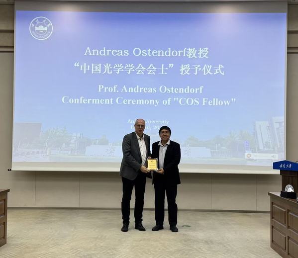 期间,中国光学学会为Andreas Ostendorf教授举行了“中国光学学会会士”荣誉称号授予仪式,李传峰教授代表学会为其颁发证书。