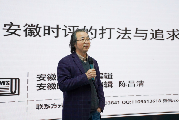 安徽日报安徽时评编辑部副总编辑陈昌清以《安徽时评的打法与追求》为题,向与会人员系统介绍了安徽时评的创办缘由、核心定位与采编标准,阐述了其“有态度、有温度、有未来”的发展现状,并明确了未来将以“深度+速度”双轮驱动、“文评+视评”比翼齐飞的发展方向。结合自身丰富的编辑经验,陈昌清还对入选评论作品逐一进行专业点评,既肯定了同学们扎根现实、关注社会的创作态度,也从评论的立意、视角、表达等方面提出了针对性建议。同时,他结合当下传播环境,就AI写作现象分享了见解,强调新闻评论的核心价值在于创作者的独立思考、独特视角与真情实感,AI仅能作为辅助工具提供参考,鼓励同学们坚守独立思辨的底线,让评论作品兼具思想力度与人文温度。