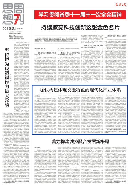 产业是经济发展的重要支撑和关键动力。省委十一届十一次全会提出,加快构建体现安徽特色的现代化产业体系。经过多年积累,安徽的外在形象和内在气质加速蝶变,发展能级显著提升,创新动能更加强劲,产业基础更加厚实,区位优势更加彰显。“十五五”时期是安徽夯实基础、全面发力、创先争优、奋力追赶的关键时期。我们要聚焦实体经济根基,强化科技创新引领,完善制度保障体系,促进科技创新与产业创新深度融合,加快构建体现安徽特色的现代化产业体系,为培育新质生产力注入强劲动能。