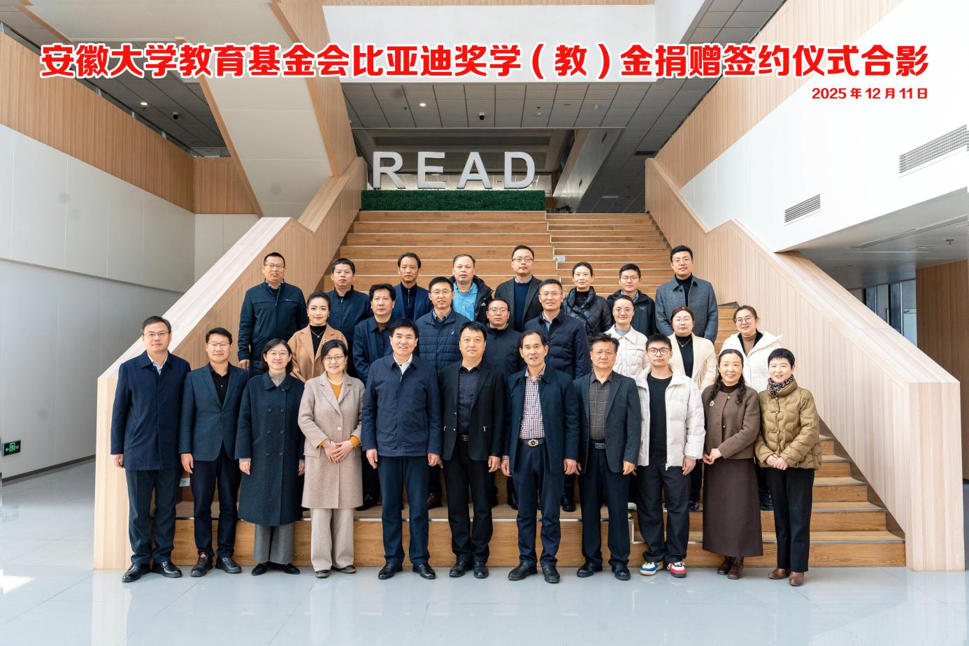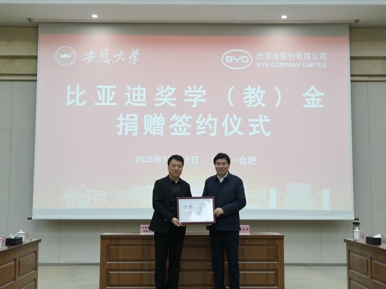 签约仪式上,双方代表共同签署捐赠协议。随后,比亚迪股份有限公司向安徽大学授予捐赠牌,虞宝桃向陈武军颁发捐赠证书。