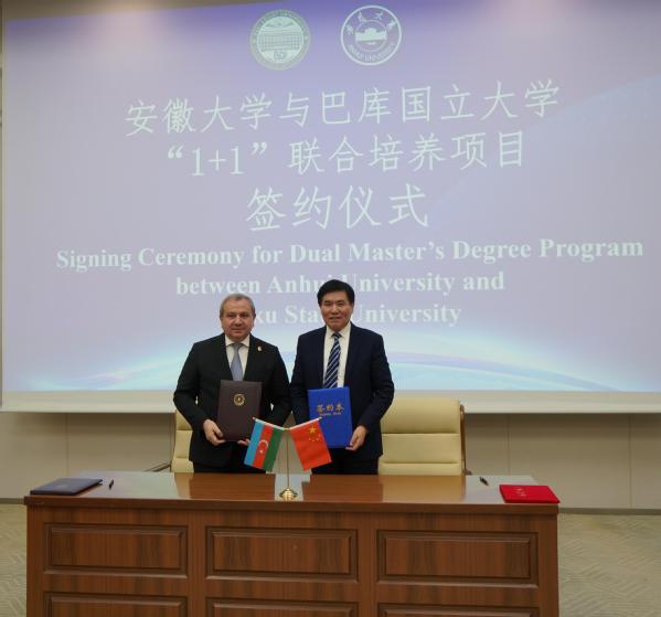 埃尔钦·巴巴耶夫、虞宝桃分别代表巴库国立大学和安徽大学续签共建孔子学院合作协议,签署“1+1”联合培养项目协议。