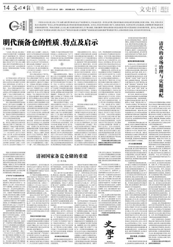 本网讯(马克思主义学院)我校马克思主义学院教授、安徽省淮河文化传承与创新发展研究院常务副院长张崇旺老师于2025年12月8日《光明日报》理论版发表最新研究成果《明代预备仓的性质、特点及启示》。文章认为,明代预备仓是由官方创设、覆盖全国的备荒仓储,既吸收常平仓、义仓等功能,又与之相区别,是贯穿明代的常设制度。其特点包括:由国家推动普遍设立,发展呈现时空不平衡,管理权由初期民间参与逐渐收归官方。预备仓体现了以民为本的治理思想,并在实践中尝试官民协作,但因制度僵化、难以适应地方差异等问题,后期效能逐渐衰退,反衬出仓储政策需兼顾规范性与灵活性。