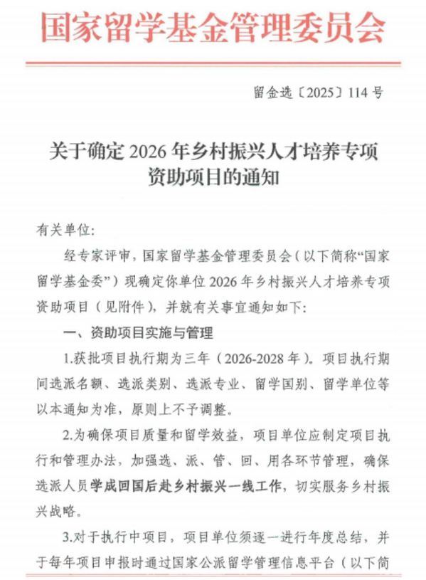 项目首批人员选拔工作预计于2026年4月正式启动,将在三年周期内选拔18名博士/硕士研究生及访问学者,赴国外高校和机构进行联合培养,精准服务国家乡村振兴战略对高层次、国际化应用型人才的迫切需求。