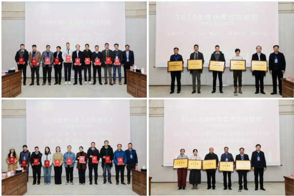 王守国宣读校友工作评选表彰决定。周飞、匡光力、王守国、虞宝桃先后为2025年度校友工作突出贡献奖、2025年度优秀校友组织、2025年度校友工作先进个人、2025年度校友工作先进集体颁发证书或奖牌。