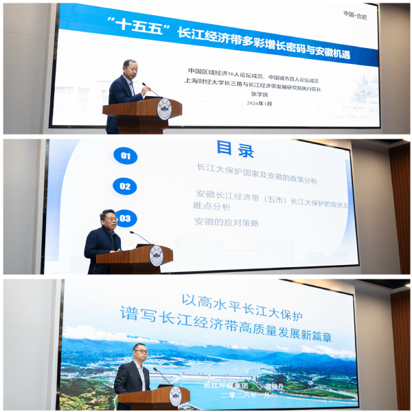在随后举行的“融汇长江力量,赋能安徽发展”研讨会上,中国区域经济50人论坛成员、上海财经大学长三角与长江经济带发展研究院执行院长张学良教授作题为《“十五五”长江经济带的“多彩”增长密码与安徽机遇》的报告;安徽财经大学原副校长、二级教授周加来聚焦《长江大保护:安徽(五市)现状、难点及应对策略》;长江环保集团副总经理唐晓丹结合产业实践,分享《以高水平长江大保护谱写长江经济带高质量发展新篇章》的思考与探索。