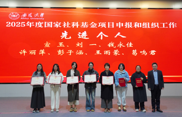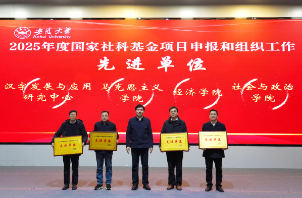 虞宝桃、汪海燕为获得2025年度国家社科基金项目申报和组织工作先进个人和先进单位颁发证书。获奖单位代表社会与政治学院院长张军、经济学院院长江永红、马克思主义学院院长李明、汉字发展与应用研究中心主任徐在国作经验分享交流。