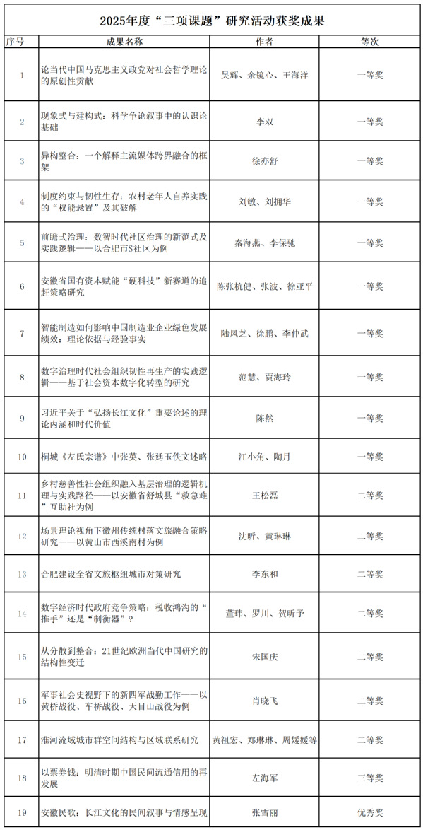 本网讯(人文社会科学处)近日,安徽省社会科学界联合会公布了2025年度“三项课题”研究活动获奖成果情况,我校教师有19项优秀成果获奖,其中一等奖10项,二等奖7项,三等奖1项,优秀奖1项,位居安徽高校前列。同时,我校社科联荣获2025年度“三项课题”研究活动先进单位。