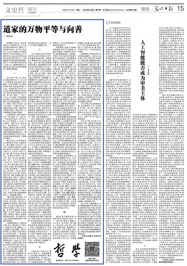 本网讯(融媒体中心)1月26日,《光明日报》第15版文史哲周刊·理论·哲学栏目刊发了我校哲学学院陆建华教授的理论文章《道家的万物平等与向善》。文章指出,中国道家哲学对物的重视和强调,形成了“万物平等与向善”的核心主张,这一精神特质也为中国哲学自主知识体系的构建提供了重要思想资源。