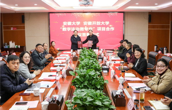 本网讯(继续教育学院 袁倩倩)2月2日上午,学校与安徽开放大学在远程教育大厦签署“数字法治微专业”共建合作协议。校党委常委、副校长黄志祥,安徽开放大学党委书记、校长杜爱玉出席活动并致辞。活动由安徽开放大学党委委员、副校长诸咸斌主持。