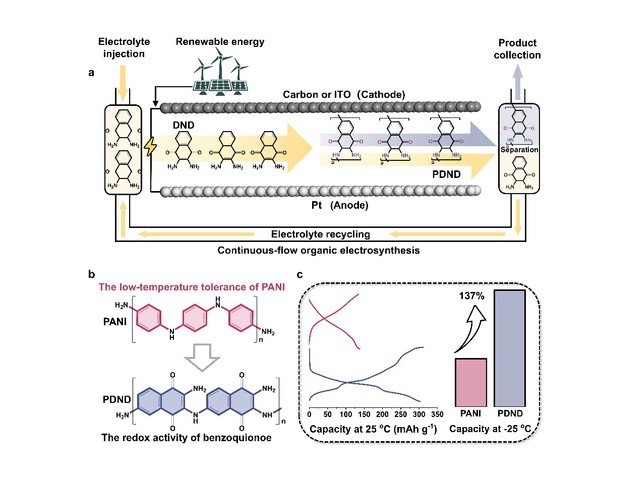 图 (a) PDND的连续流有机电合成示意图及其(b)分子结构和(c)电化学性能