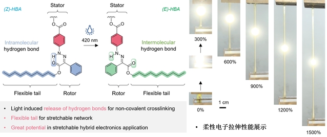 随着健康监测、植入式医疗和智能人机交互等领域的快速发展,可拉伸电子器件因其能适应复杂形变而备受关注。然而,这类设备通常由柔性电路与硬质芯片粘接而成,不同材料间的机械性能差异导致界面在拉伸或弯曲时极易失效,成为制约其可靠性的核心瓶颈。宣俊教授团队从分子层面入手,设计了一种基于腙光开关结构的智能胶黏剂。该材料在420 nm可见光照射下,触发内部腙发生Z→E构型转变,实现分子内氢键向分子间氢键转化,仅需10 min即可实现对粘接界面的局部加固与精准强化,避免了传统光固化方法导致材料整体变脆的问题。研究表明,经光照处理后,该胶黏剂对多种基材的粘附韧性均获显著提升。基于此胶黏剂制备的柔性可拉伸电子器件,在1500%的极端拉伸应变下仍能保持结构完整和电学性能稳定,并在200%应变循环测试中稳定运行超过10000次,展现出优异的耐久性。该研究为柔性电子领域长期存在的机械不匹配问题提供了全新解决方案,也为腙光开关在未来柔性电子系统中的应用开辟了新路径。