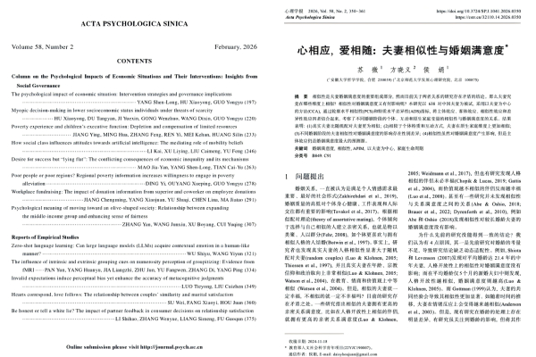 本网讯(哲学学院)我校哲学学院教授侯娟与其研究生苏微于2026年2月25日在国内心理学类顶级期刊《心理学报》发表最新研究成果《心相应, 爱相随: 夫妻相似性与婚姻满意度》。该研究基于638对中国夫妻的成对数据,系统探讨了夫妻在不同婚姻阶段的相似性及其对婚姻满意度的影响,为理解婚姻关系的动态演变提供了全新的视角。