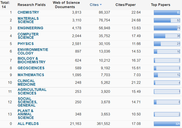 到目前为止,我校已有13个ESI前1%学科,分别是化学、工程学、材料科学、计算机科学、数学、环境/生态学、物理学、生物与生物化学、一般社会科学、临床医学、地球科学、植物与动物科学和农业科学。